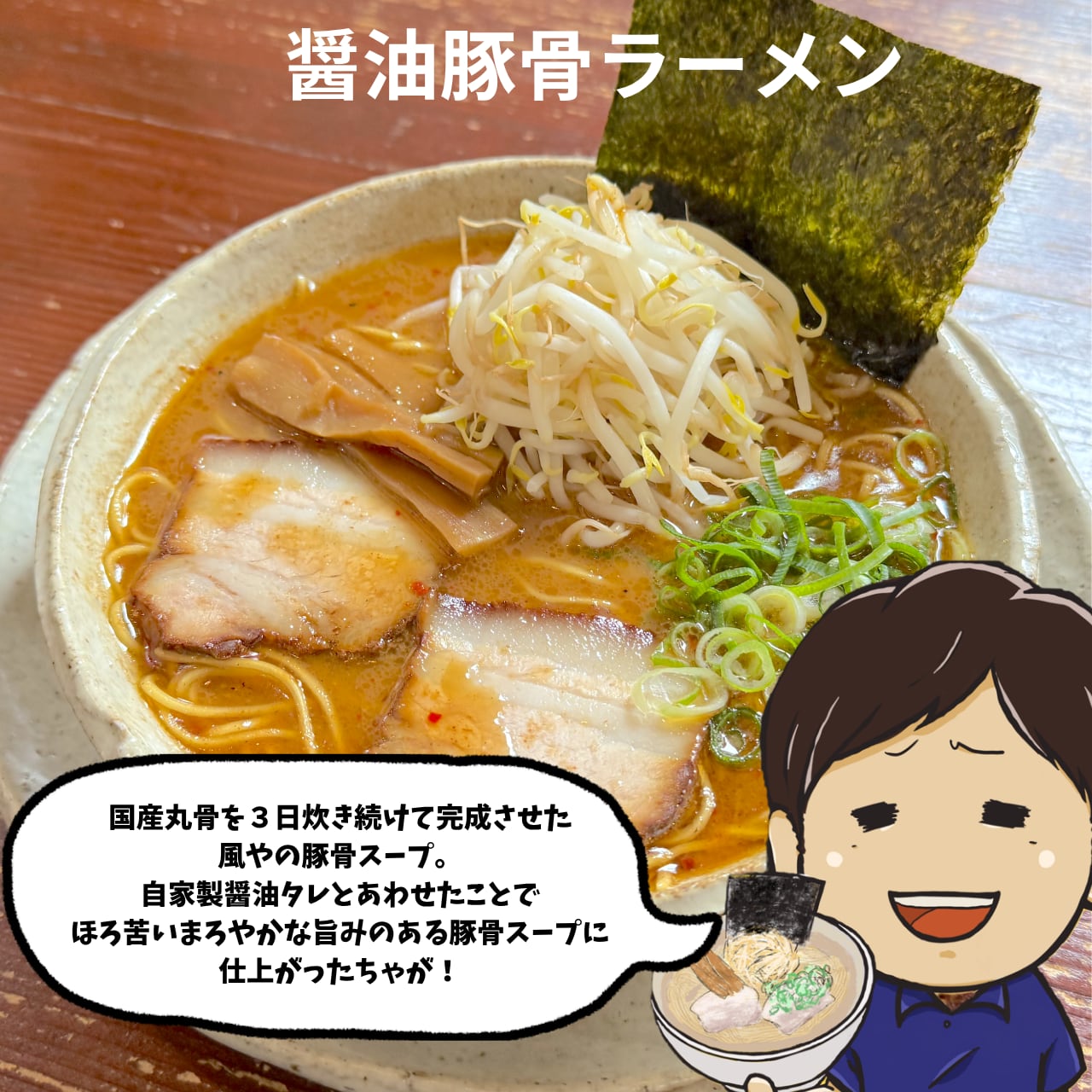 (期間限定)裏メニュー・醤油豚骨ラーメン – 3日炊き続けた豚骨スープと自家製醤油タレの、ほろ苦く旨みのある味わい。